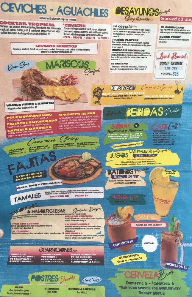 La Costa, Olas is a vibrant Honduran-Latin American-Mexican restaurant located in Fort Lauderdale, FL. This casual spot offers delivery and takeout, making it a convenient choice for groups looking for a delicious dinner. The menu boasts a variety of enticing options, from the flavorful Camarones al Ajillo to the refreshing Horchata Mexicana. Customers rave about the delicious food, friendly service, and lively atmosphere. The shrimp dishes are particularly popular, with unique flavors like Tequila Buffalo Wings and Camarones Empanizados. The drinks menu offers a range of Mexican and Honduran beverages, including fresh-squeezed orange juice and Jarritos. Overall, La Costa, Olas is a must-visit spot for those craving authentic Latin American cuisine and a welcoming dining experience.
